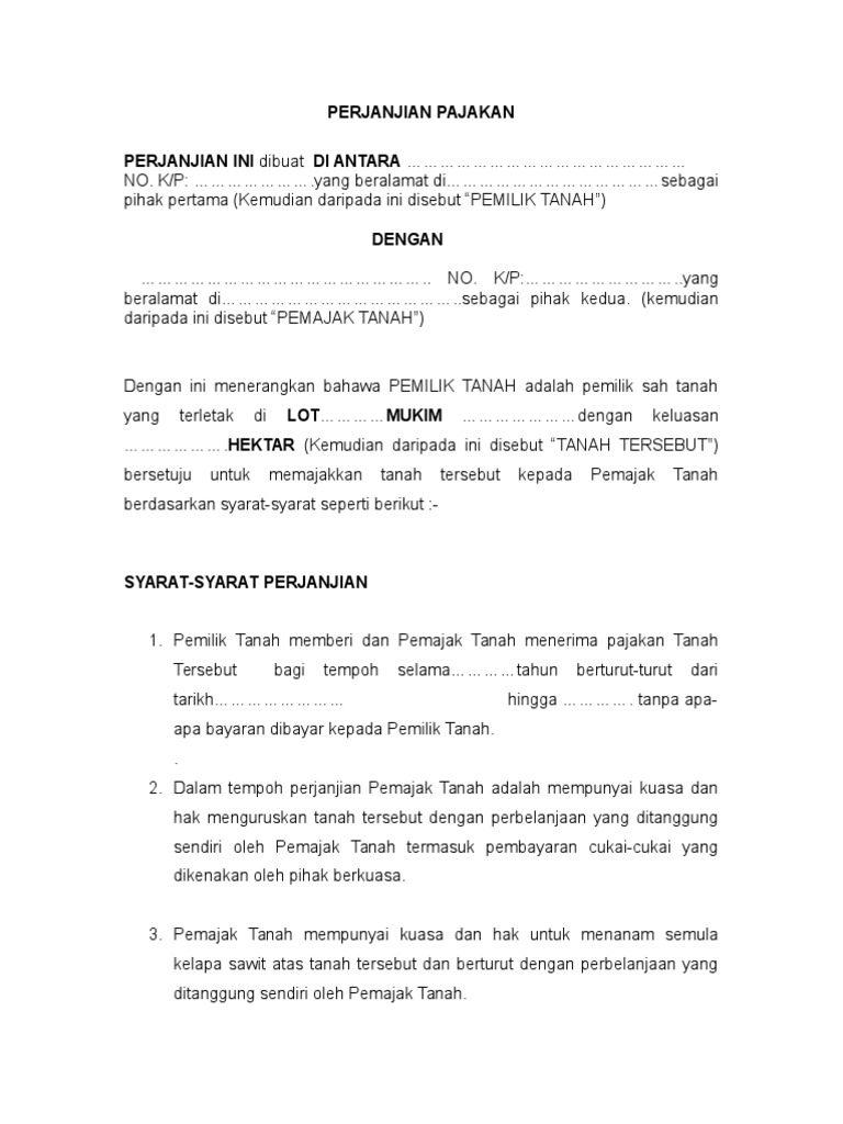 Download Surat Perjanjian Pajakan Tanah Download format surat lain. 49935 hektar 132392 ekar tanah pertanian pajakan 99 tahun saya ada satu ladang berkeluasan 49935 hektar atau lebihkurang.